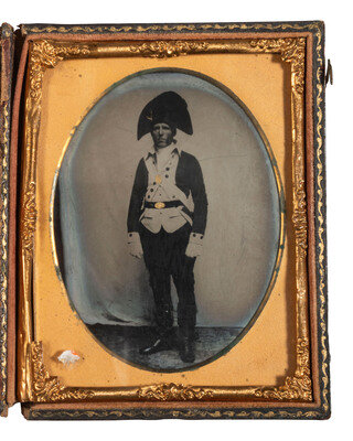 [MILITIA]. Tintype of a militiaman wearing a Rev. War Continental-style tailcoat & cocked hat.