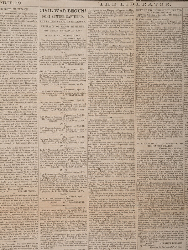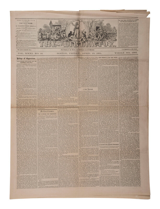 4pp., folio, 25 x 18 in. An anti-slavery newspaper containing prominent, inside page “stacked” headlines, “Civil War Begun! / Fort Sumter Captured…/ The North United at last…” with detailed coverage of the first engagement of the Civil War. The battle, which took place from 12-13 April 1861, began when Confederate troops fired on Fort Sumter in Charleston Harbor, and ended when Union forces surrendered 34 hours later. (Folds, with some soiling near fold lines. Light edge wear, including creasing, few short tears.)