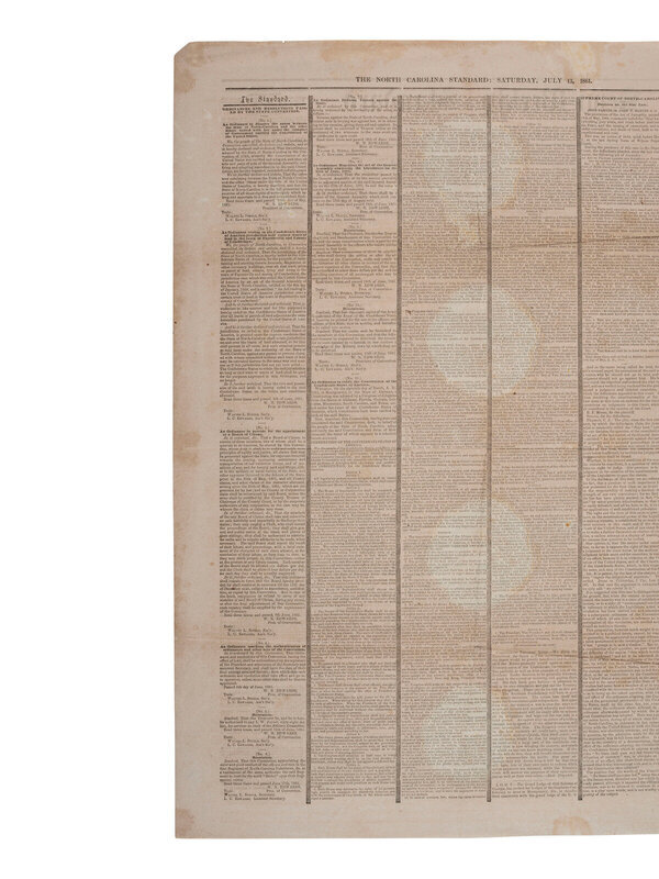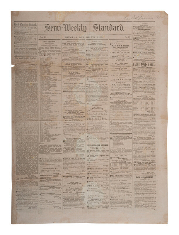Raleigh Semi-Weekly Standard. Vol. XI, No. 64. Raleigh, NC: Wm. W. Holden, 13 July 1861. 4pp., folio, 25 x 18 1/4 in. This Confederate newspaper published early in the Civil War features a printing of the Ordinance of Secession recently passed by North Carolina to secede from the Union and thus join the Confederacy (page 2). (Folds. Soiling throughout. Wear, including small holes and areas of separation near centerfold. Some tape repairs.)