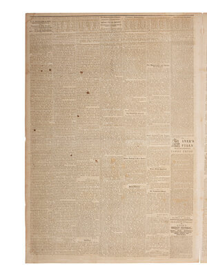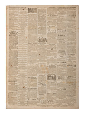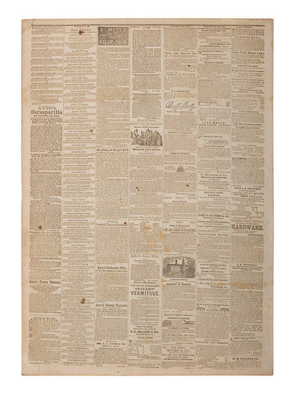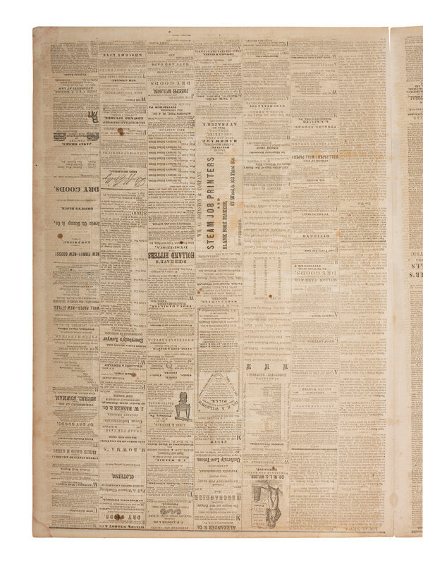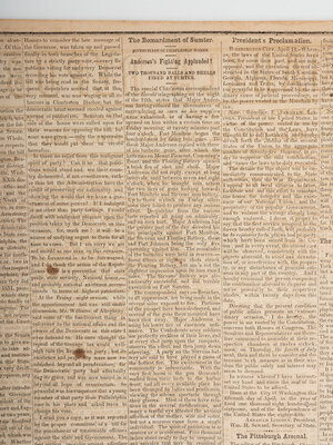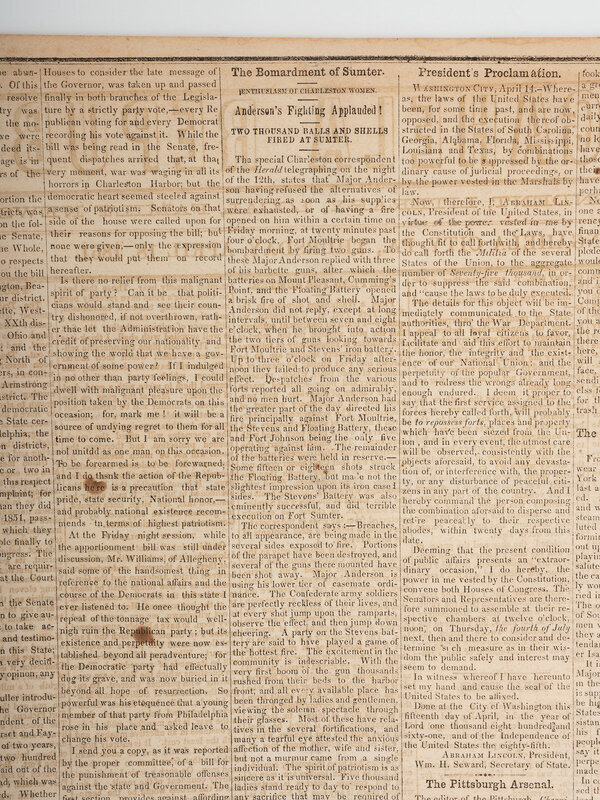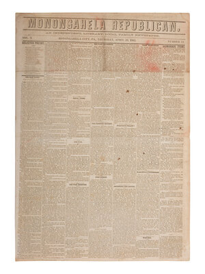 Monangahela Republican. Vol. X, No. 11. Monangahela City, PA: 18 April 1861. 4pp., folio, 17 1/4 x 24 3/4 in. Disbound (adhesive repair to separation at central fold, red residue to front cover, light chipping, occasional spotting, some toning or light staining to margins and at horizontal folds). Provenance: Library of Stephen Foreman (blindstamp on newspaper, lower right). The newspaper contains prominent, inside page headlines and a detailed account of the Confederate bombardment of Fort Sumter, South Carolina, marking the beginning of the Civil War. The issue also includes a Proclamation dated 15 April 1861 signed in type by President Abraham Lincoln, proclaiming the Southern Confederacy to be in a state of rebellion against the Federal Government and, in essence, declaring war on the Confederacy.