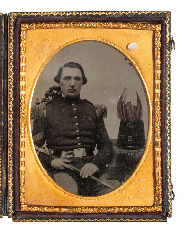 Seated portrait of an unidentified militia sergeant holding a common militia pattern NCO sword diagonally across his lap, and wearing a regulation Model 1858 frock coat with militia pattern worsted fringe epaulettes. A Model 1851 shako bearing company letter "E" and red-tinted plumes rests on the table next to him. (Good clarity and contrast, few imperfections to image surface; unsealed.) Housed in a leatherette case (nearly fully separated at spine with cloth repair, with heavy surface wear throughout).