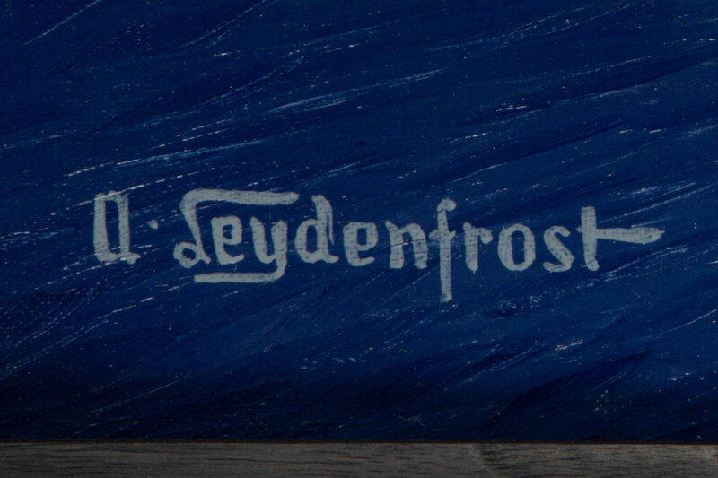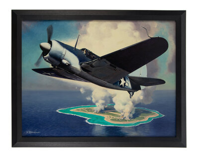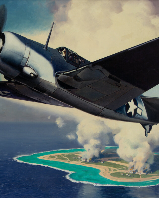 Oil on canvas painting of a SB2C Helldiver flying away from a freshly-bombed military base, signed by Leydenfrost at bottom left (minor deformation at center). Visible area 29 × 22 in. Frame: 32 1/4 × 25 1/4 in. Provenance: A Private Collection.