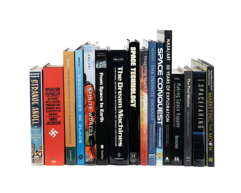 BERINSTEIN, Paula (b. 1950). Making Space Happen: Private Space Ventures and the Visionaries Behind Them. Medford, NJ: Medford Press, 2002. -- COHEN, Daniel (1936-2018). The Great Airship Mystery: A UFO in the 1890s. New York: Dodd, Mead, & Company, 1981. -- DORNBERGER, Walter (1895-1980). V-2. New York: The Viking Press, 1954. -- DYSON, George (b. 1953). Project Orion: The True Story of the Atomic Spaceship. New York: Henry Holt & Company, 2002. SIGNED BY DYSON. -- HOBBS, Marvin. Fundamentals of Rockets, Missiles, and Spacecraft. New York: John F. Rider Publisher, Inc., 1962. -- JACOBSEN, Annie (b. 1967). Operation Paperclip: The Secret Intelligence Program That Brought Nazi Scientists to America. New York and Boston: Little, Brown & Company, 2014. -- PENDLE, George (b. 1976). Strange Angel: The Otherworldly Life of Rocket Scientist John Whiteside Parsons. New York, et al: Harcourt, Inc., 2005. -- STOOKE, Philip J. The International Atlas of Mars Exploration. New York: Cambridge University Press, 2012. 2 volumes.