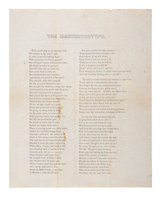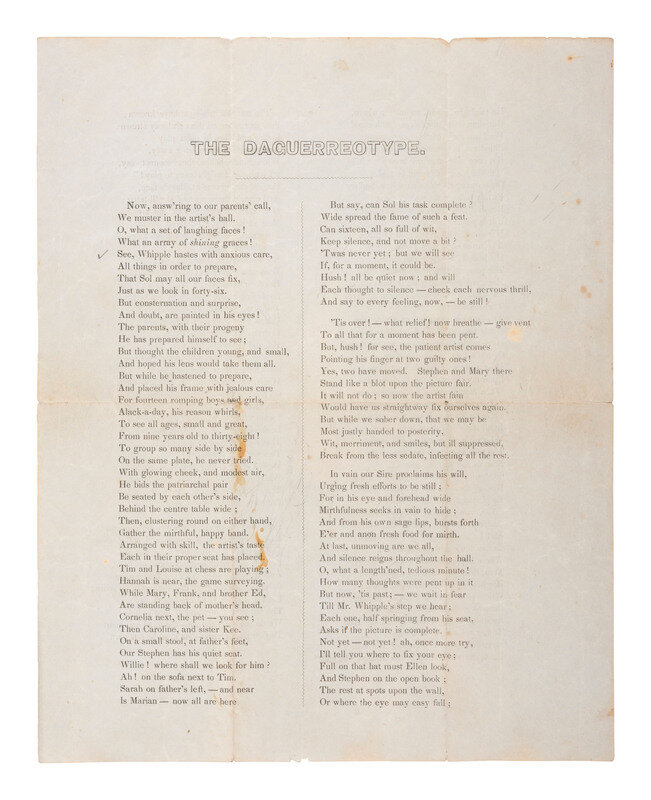 "The Daguerreotype." N.d. [ca 1846?], N.p. [Boston?]. 1p, printed recto and verso, 7 3/4 x 9 3/4 in. A light-hearted rhyming poem in which the unidentified author describes the boisterous portrait-sitting of a family with fourteen children and a photographer identified as "Whipple." The author identifies all 14 children by name, relates their efforts to remain still, relays the relief when they believe the sitting is over, and conveys the dismay experienced when the photographer informs them that two children moved and the image must be retaken. The poem reads, in small part: "Now, ans'ring to our parents' call, / We muster in the artist's hall. / O, what a set of laughing faces! / What an array of shining graces ! / See, Whipple hastes with anxious care, / All things in order to prepare, / That Sol may all our faces fix, / Just as we look in forty-six." "But once more now our breath we hold / 'Till sixty seconds could be told. / Once more, we brace ourselves, and try / Firmly to keep the watery eye; / Resolved, this time, at least, we will / If it is possible, be still. 'Tis done! and to our glad surprise, The artist now, with glowing eyes / Holds up to our delighted view / The pictured group; so strictly true!"