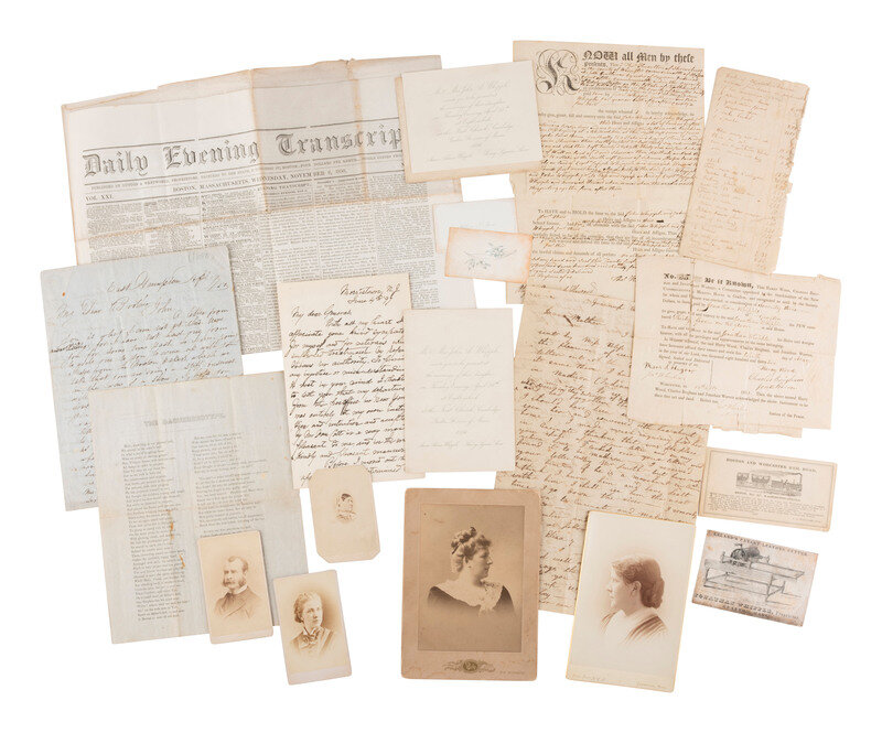 [Also with:] Ephemera spanning generations and various branches of the families including a wedding invitation, calling cards, newspapers, and an early advertising card for the "Boston and Worcester Rail Road." The first nine miles of the Boston & Worcester was completed between Boston and Newton, Massachusetts, in April 1832. Though not the first railroad in Massachusetts, it was the first common carrier of freight and passengers.