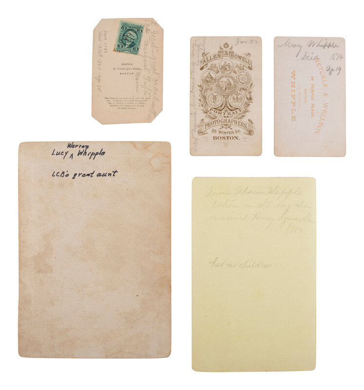 Archive of letters, documents, photographs, and ephemera related to daguerreotypist John Adams ("J.A.") Whipple and extended family members from both the Whipple family and that of his wife, Elizabeth Tufts Mann (1819-1898). Dozens of items, spanning ca 1775-1900 (bulk 1800s). Archive is highlighted by the following: an undated, printed poem "The Daguerreotype" which describes photographer John A. Whipple at work; an October 1828 letter from Aaron Tufts (1793-1840) to his mother Margaret Rich Tufts (1758-1846) describing Ohio and Kentucky as well as the political sentiment surrounding the 1828 Presidential Election; a printed advertising card for the Boston and Worcester Rail Road, ca July 1834; and an assortment of photographs and other ephemera related primarily to children of John and Elizabeth Whipple.