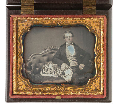 [EARLY PHOTOGRAPHY]. Sixth plate daguerreotype of a young man with his Dalmatian.