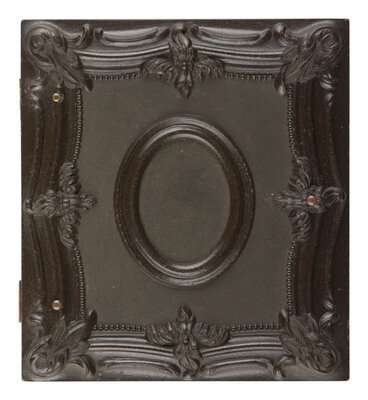 Landscape-oriented portrait of a young man sitting on an upholstered sofa with his adorable canine companion resting up against his leg. (Tarnishing to edges, some spotting, area of clouding/weeping to lower right, spotting to mat; resealed.) Housed in a Union case with geometric/scroll design (general wear). An utterly charming portrait.