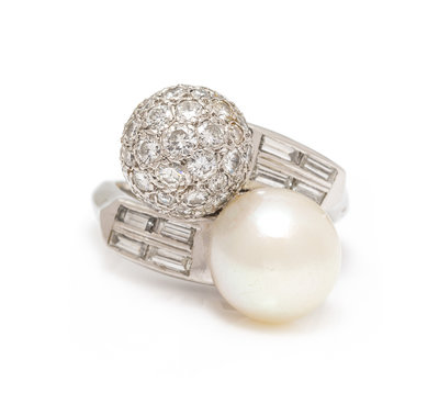 A Platinum, Cultured Pearl and Diamond 'Toi et Moi' Ring, 6.75 dwts.