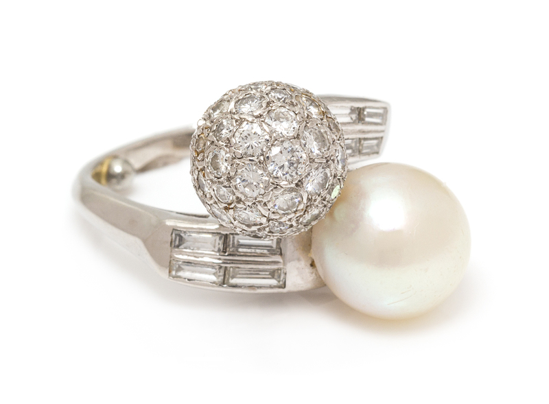 containing one cultured pearl measuring approximately 8.00 mm in diameter, numerous round brilliant cut diamonds and eight baguette cut diamonds weighing approximately 0.40 carat total.Stamp: (obscured).