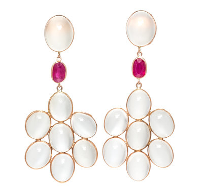 A Pair of Rose Gold, Moonstone and Ruby Pendant Earrings, 9.70 dwts.