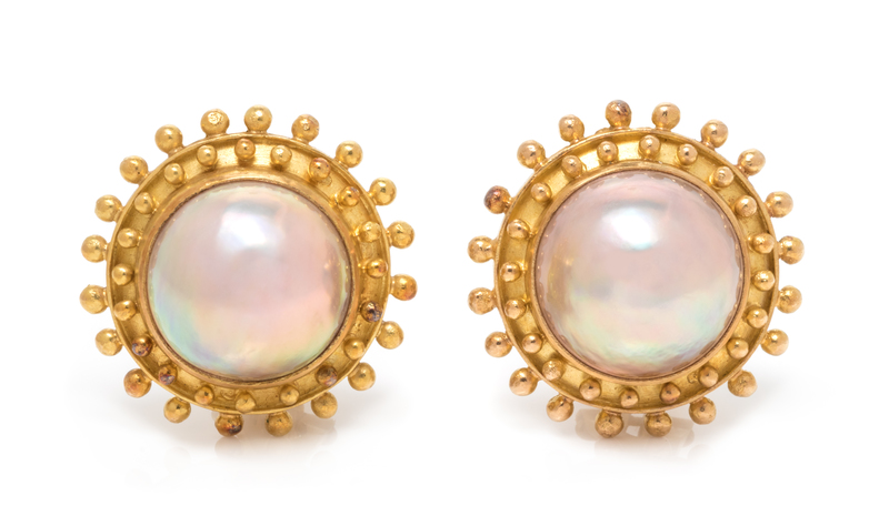 containing two mabe pearls measuring approximately 16.00 mm in diameter within beaded gold surround, collapsible posts with clip backs.Stamp: 18K (maker's mark for Elizabeth Locke).