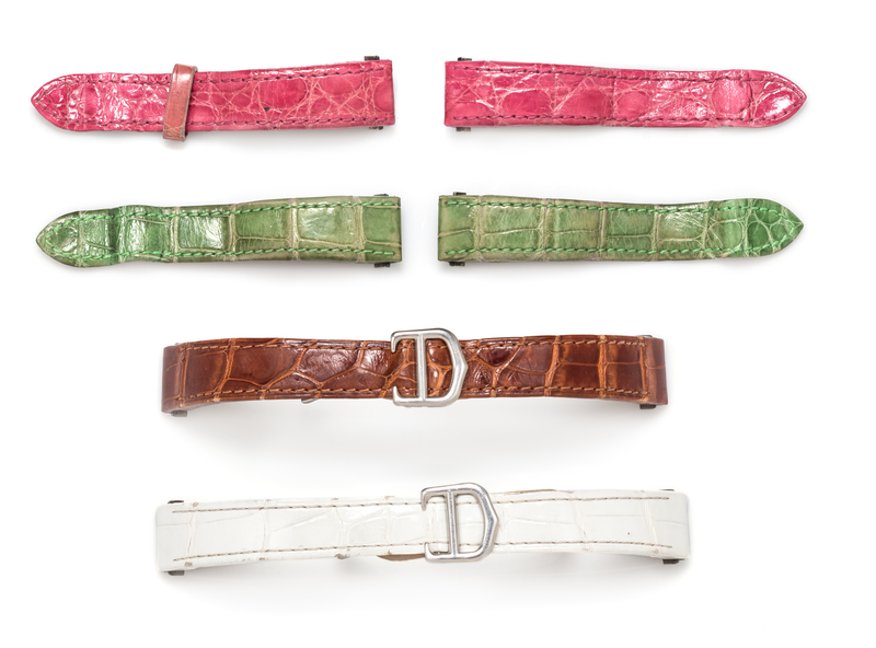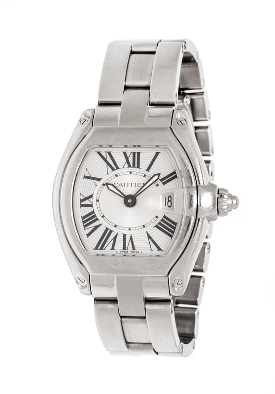 29.00 x 32.00 mm case dimensions exclusive of lugs, center-sunk silvered dial signed Cartier with secret signature at 10 o'clock, black Roman numerals, luminous sword hands, date aperture at 3 o'clock with magnifier in crystal, tonneau shaped case, coin edge crown, case back affixed with four screws, quartz movement, stainless steel link bracelet, double deployant clasp.Accompanied by original two additional Cartier leather straps, two additional Cartier straps with clasps, a booklet with certificate dated 2-2-04, instruction book, and case signed Cartier.