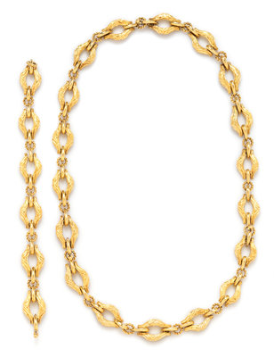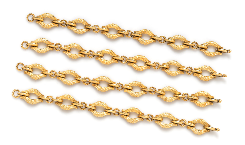consisting of four navette shape textured fancy link bracelets that can be worn separately or combined as a necklace(s)/bracelet.Stamp: ITALY 18K.