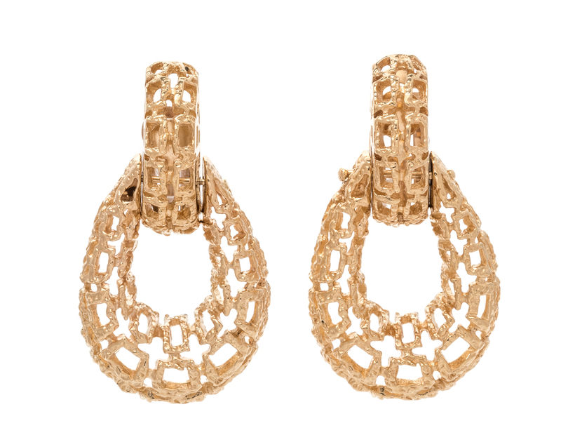 consisting of doorknocker hinged pendants in a geometric openwork design.Stamp: CO 14K.