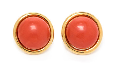 A Pair of 18 Karat Yellow Gold and Coral Earclips, Gump's, 14.55 dwts.