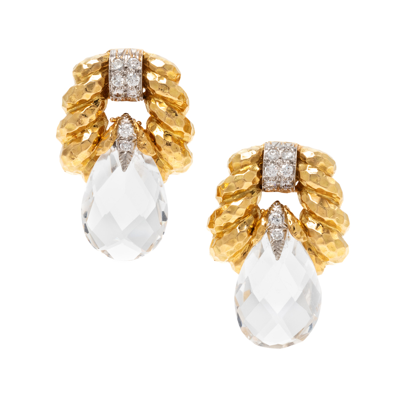 with a heavy hammer finish, the center suspending two hinged briolette rock crystal pendants measuring approximately 21.80 x 14.40 mm and 16 round brilliant cut diamonds weighing approximately 0.48 carat total.Stamp: WEBB PLAT 18K.