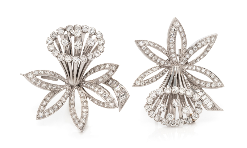 containing 44 round brilliant, 11 baguette and 122 round single cut diamonds weighing approximately 5.00 carats total, with white gold clip backs.Stamp: (partially obscured French hallmark) DEPOSE.