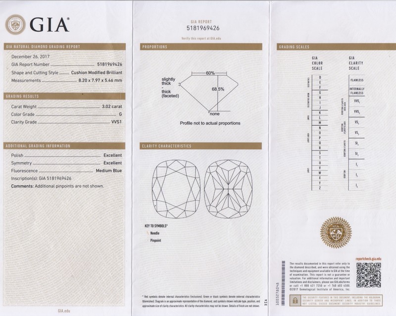 measuring 8.20 x 7.97 x 5.46 mm.Accompanied by a Gemological Institute of America diamond grading certificate number 5181969426, dated December 26, 2017, stating Color: G, Clarity: VVS1, Polish: Excellent, Symmetry: Excellent, Fluorescence: Medium Blue.
