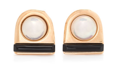 containing two mabe pearls measuring approximately 16.00 mm in diameter and rectangular onyx plaques measuring approximately 25.00 x 5.00 mm, posts with clip backs.Stamp: 14K.