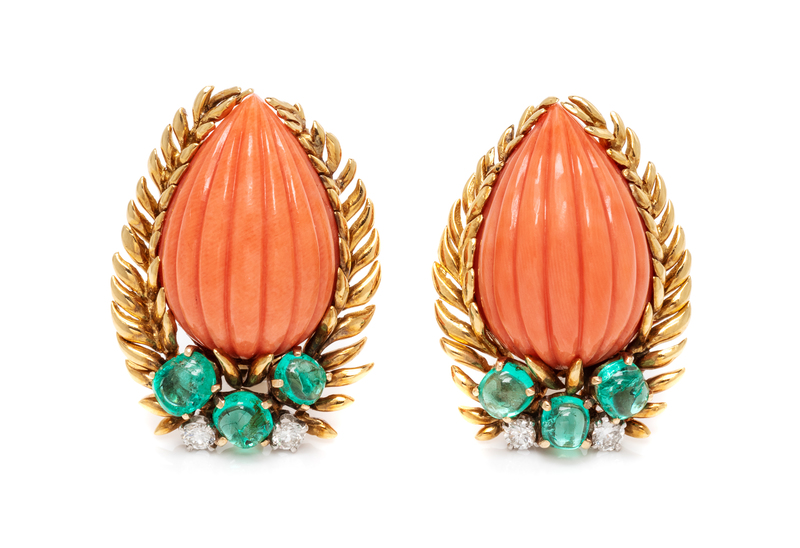 A Pair of 18 Karat Yellow Gold, Coral, Emerald and Diamond Earclips, David Webb, 16.70 dwts.