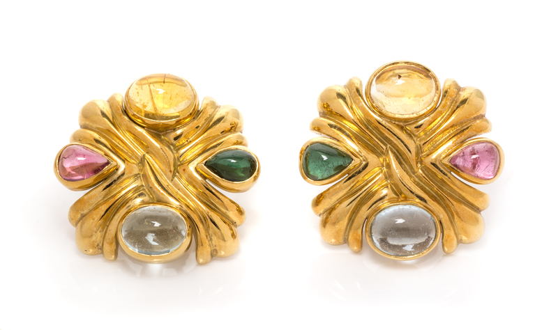 A Pair of 18 Karat Yellow Gold and Multigem Earclips, 18.45 dwts.