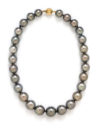 containing 27 Tahitian pearls measuring approximately 11.95-15.80 mm in diameter strung knotted with a yellow gold clasp.Stamp: Au585.