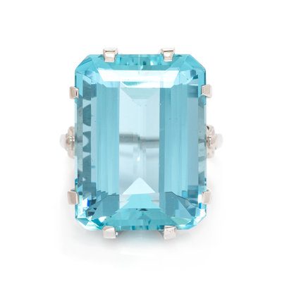containing one octagonal step cut aquamarine measuring approximately 20.33 x 15.30 x 9.82 mm.Stamp: (partially obscured)18K (obscured maker's mark).