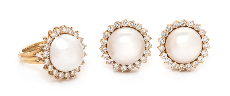 consisting of a ring containing one mabe pearl measuring approximately 15.00 mm in diameter and 19 round brilliant cut diamonds weighing approximately 1.30 carats total together with pair of earclips containing two mabe pearls measuring approximately 14.85-15.30 mm in diameter and 38 round brilliant cut diamonds weighing approximately 2.65 carats total, posts with clip backs.