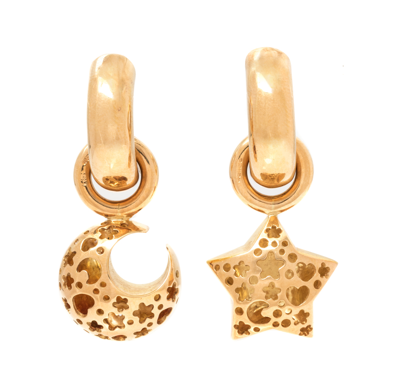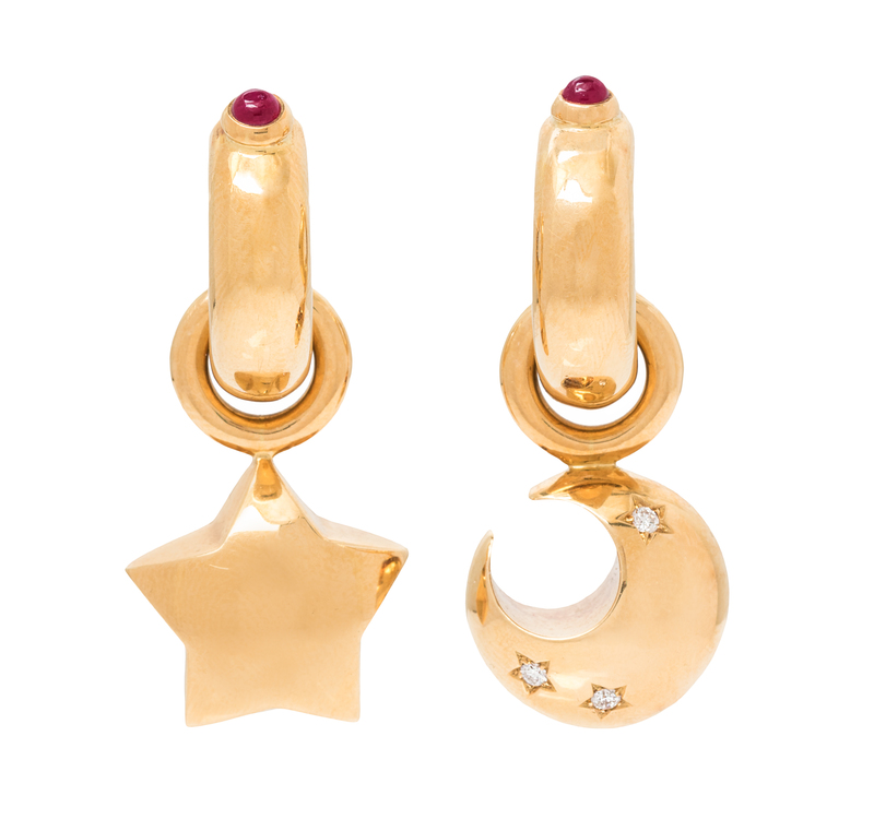consisting of a pair of hoop earrings measuring approximately 10.00 mm wide containing two round cabochon cut rubies measuring approximately 3.00 mm in diameter and suspending removable star and moon shaped charms containing three round brilliant cut diamonds weighing approximately 0.06 carat total.Stamp: WEMPE 750.