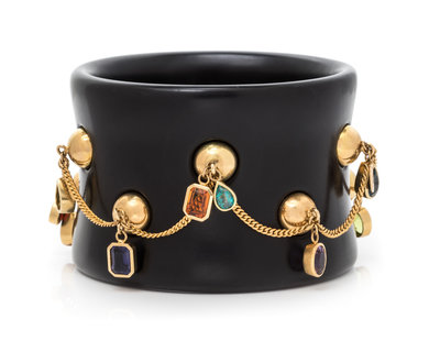 consisting of a black resin bangle with applied gold domes suspending a curb link chain and numerous gemstones of various shapes and cuts including garnet, citrine, aquamarine, iolite, amethyst, blue topaz and synthetic stones, bracelet measures approximately 2 1/4 inches wide.Stamp: 750 (French hallmark and maker's mark).