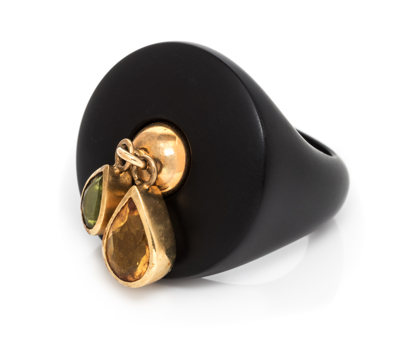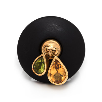 consisting of a black resin ring with applied gold dome suspending a pear shape mixed cut citrine and peridot.