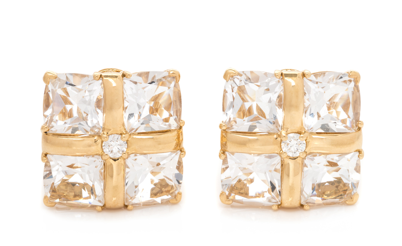 A Pair of 18 Karat Yellow Gold, Rock Crystal and Diamond 'Quad' Earclips, Seaman Schepps, 8.10 dwts.