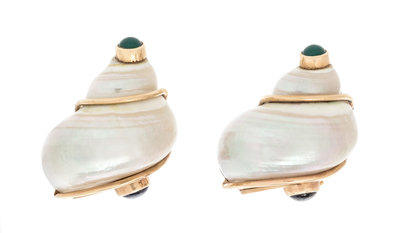 containing two turbo shells within yellow gold wirework accented with two round cabochon cut emeralds measuring approximately 4.20 mm in diameter and two round cabochon cut sapphires measuring approximately 5.20 mm in diameter.Stamp: P.S.V. OF SEAMAN SCHEPPS.Clip back stamp: 14K.