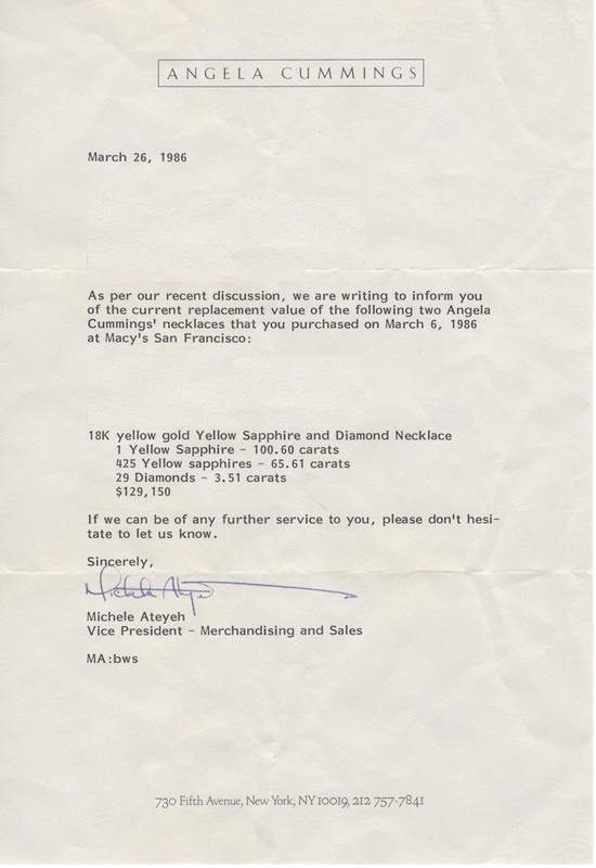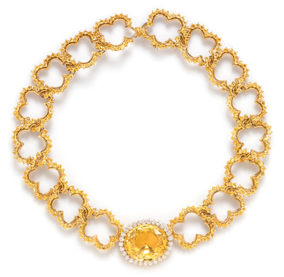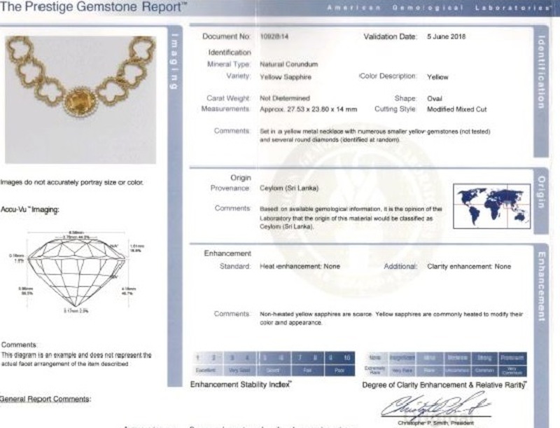 consisting of a central oval shape mixed cut yellow sapphire weighing 100.60 carats surrounded by 29 round brilliant cut diamonds weighing 3.51 carats total, attached are 16 free-form cloud shaped links containing numerous round mixed cut yellow sapphires weighing approximately 65.00 carats total. Stamp: 1984 CUMMINGS 18K.Accompanied by American Gemological Laboratories sapphire identification and origin certificate number 1092814, dated June 5, 2018, stating Mineral Type: Natural Corundum, Variety: Sapphire, Origin: Ceylon (Sri Lanka), Color: Yellow, Enhancement: No indications of heat.Accompanied by the replacement valuation from Angela Cummings dated March 26, 1986.
