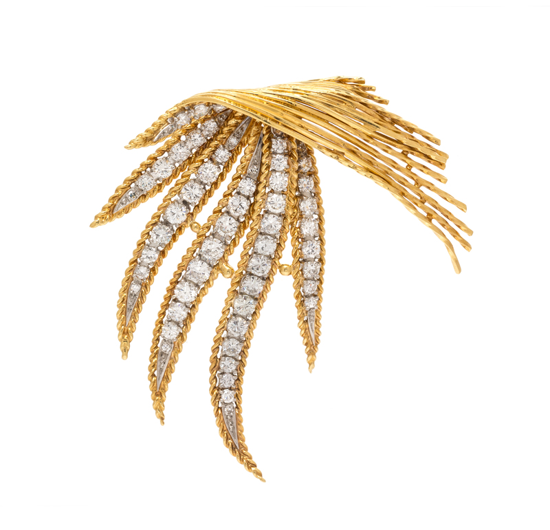 containing 55 round brilliant and single cut diamonds weighing approximately 7.00 carats total in a twisted gold spray design.Stamp: MODELE STERLE PARIS 18K MONTREAUX.Scratchmark: 9359.