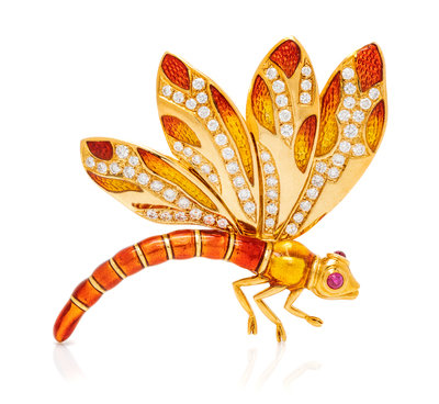 An 18 Karat Yellow Gold, Diamond, Ruby and Polychrome Enamel Dragonfly Brooch, Judith Leiber, 16.60 dwts.