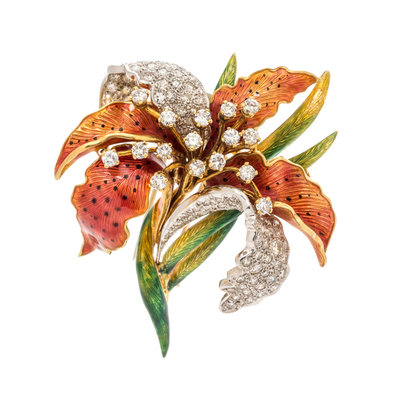 An 18 Karat Bicolor Gold, Diamond and Polychrome Enamel Lily Brooch, Italian, 29.60 dwts.