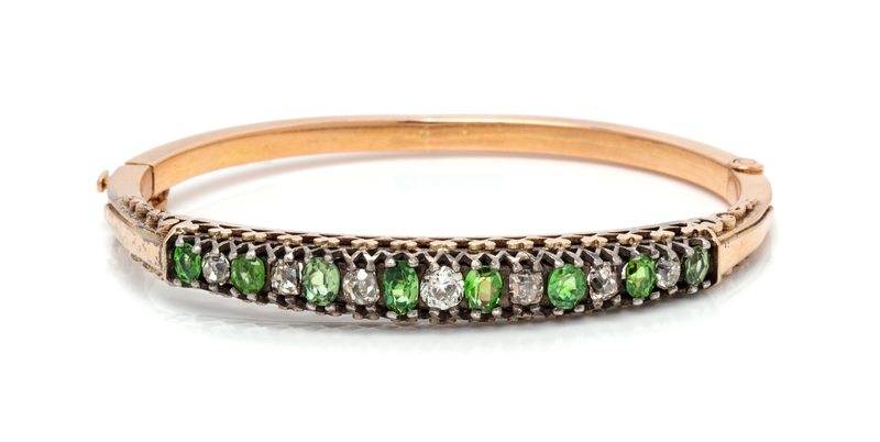 containing seven old mine cut diamonds and eight oval shape mixed cut demantoid garnets, hinged with side clasp and safety chain.