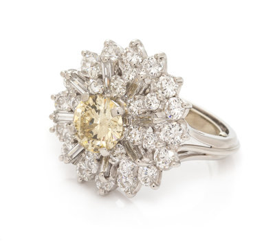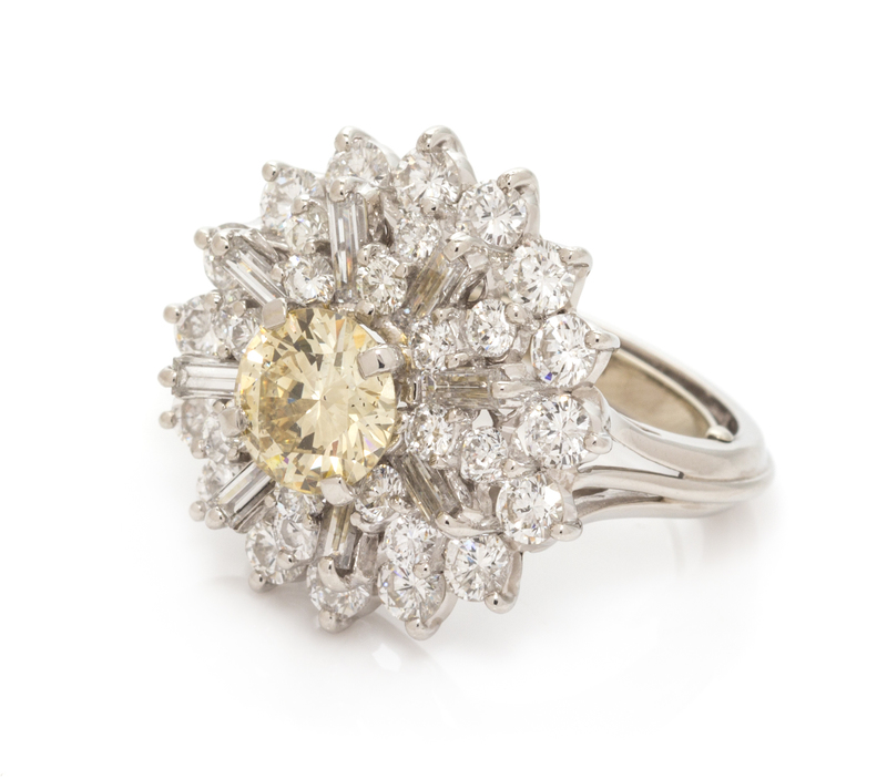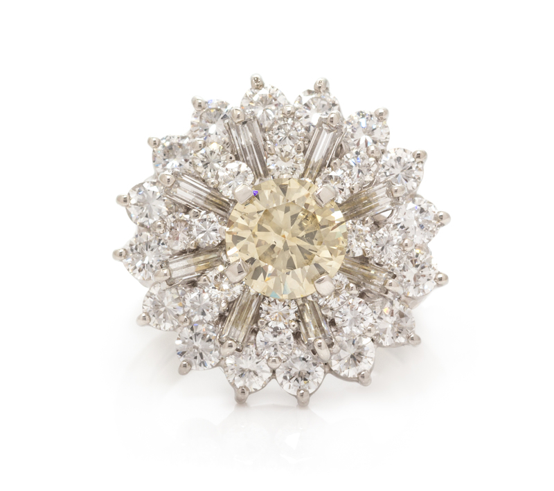 containing one round brilliant cut colored diamond (origin of color not tested) weighing approximately 1.25 carats, 32 round brilliant cut diamonds weighing approximately 1.85 carats total and eight baguette cut diamonds weighing approximately 0.80 carat total. Stamp: PLAT.
