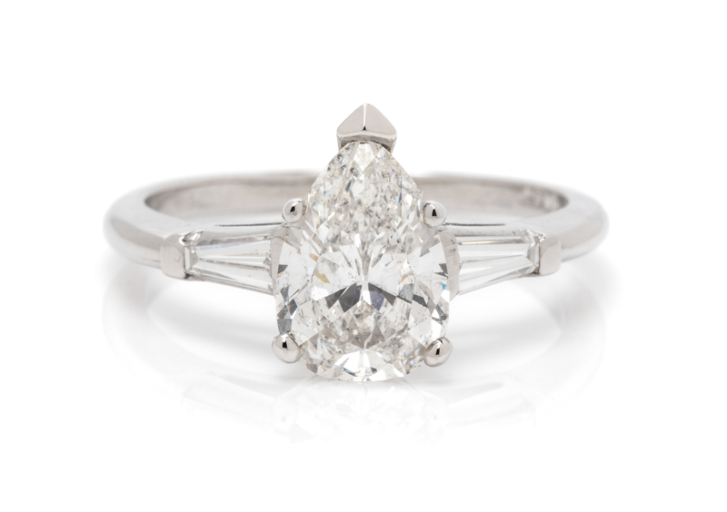 containing one pear shape brilliant cut diamond weighing approximately 1.52 carats and two tapered baguette cut diamonds weighing approximately 0.25 carat total.Stamp: PLAT.