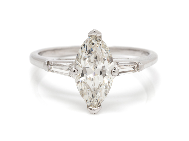 containing one marquise cut diamond weighing approximately 1.20 carats and two tapered baguette cut diamonds weighing approximately 0.15 carat total.Stamp: 14K R5180.