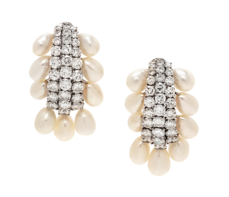 containing 76 round brilliant cut diamonds weighing approximately 5.30 carats total and 18 pearl drops measuring approximately 5.80-6.30 mm wide.Stamp: WEBB PLAT.