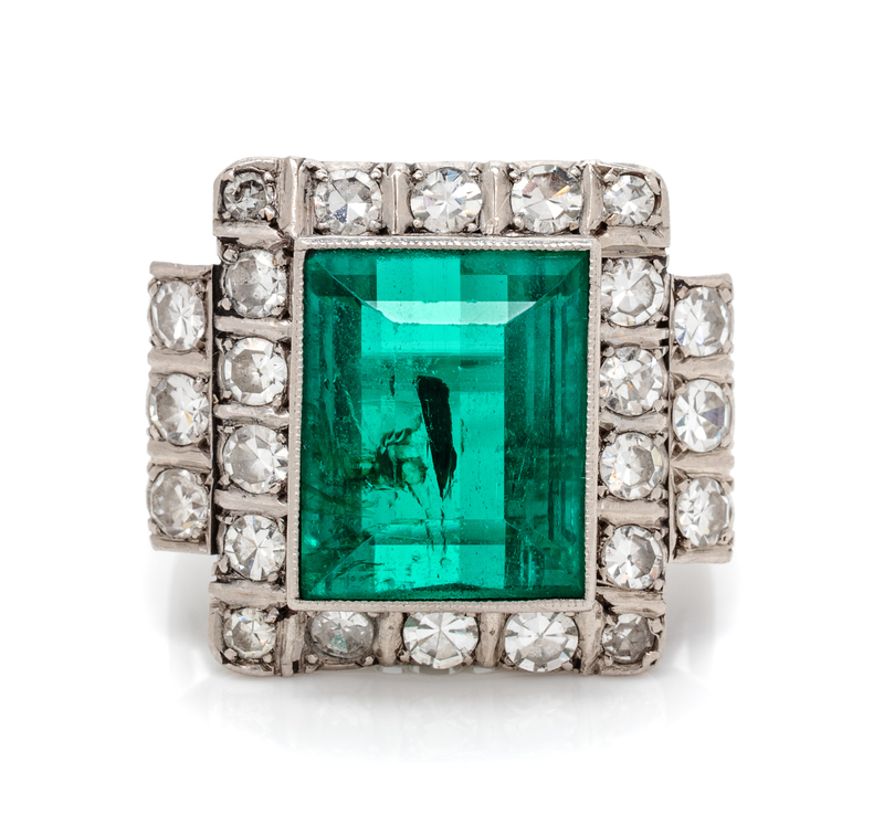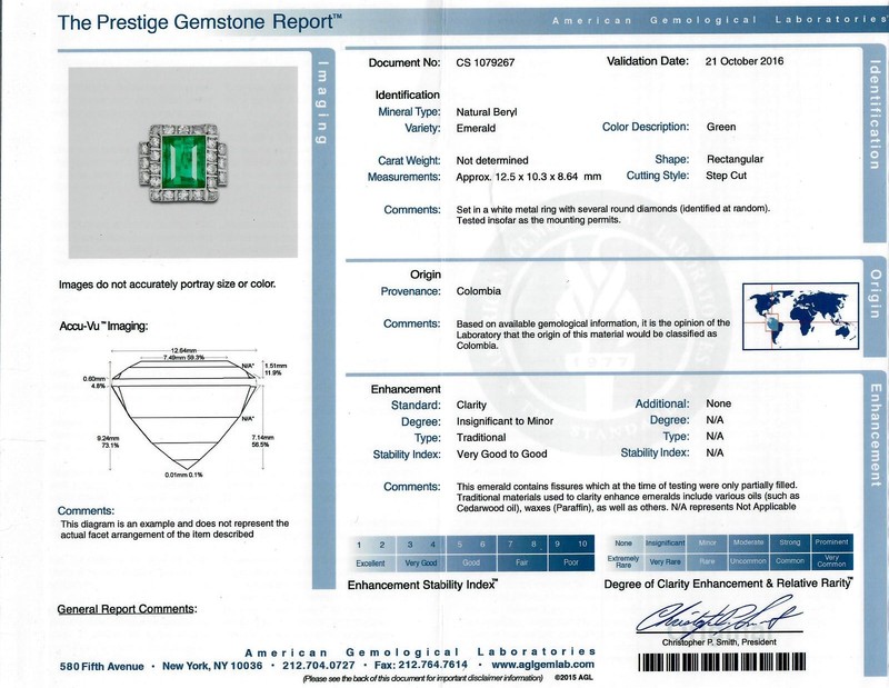 containing one rectangular step cut emerald measuring approximately 12.50 x 10.30 x 8.65 mm and 26 round single cut diamonds weighing approximately 0.80 carat total. Accompanied by an American Gemological Laboratories emerald identification and origin certificate number CS 1079267, dated October 21, 2016, stating Mineral Type: Natural Beryl, Variety: Emerald, Origin: Colombia, Clarity Enhancement: Insignificant to Minor, Traditional.