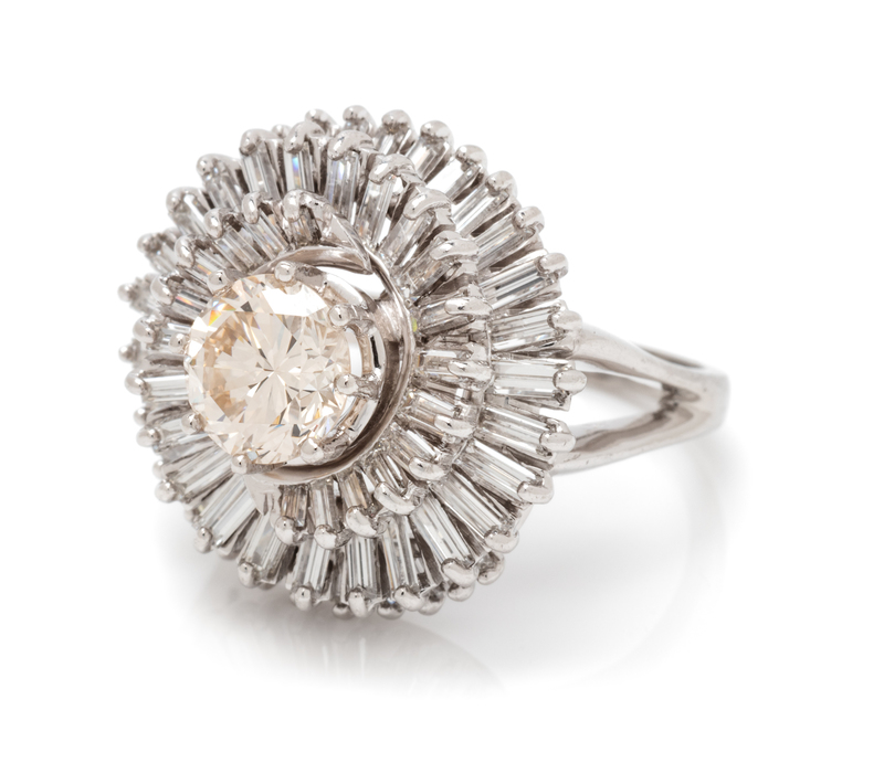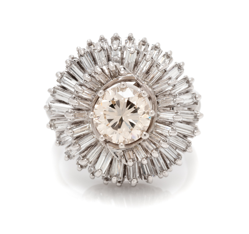 containing one round brilliant cut diamond weighing approximately 1.27 carats and 60 baguette cut diamonds weighing approximately 2.50 carats total.Stamp: .900 PLAT.100 IRID. R9707.