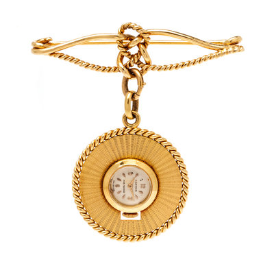 consisting of a polished and rope textured knot motif bar brooch suspending a circular watch pendant, 32.00 mm pendant diameter, 15.00 mm case diameter, matte silvered dial signed CARTIER, applied gold index and Arabic numbers, gold alpha hands, snap on case back, manual wind 17 jewel movement signed MOVADO.Brooch stamp: Cartier (obscured) (maker's mark).Pendant stamp: (French hallmark and maker's mark).Inner case back stamp: MOVADO 127127 6194 (French hallmark).