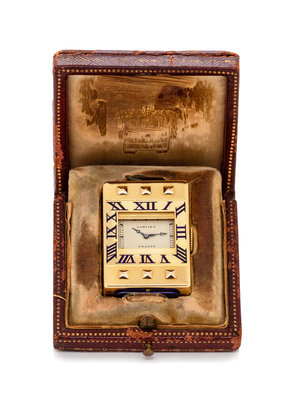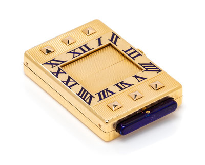 measuring approximately 41.00 x 28.00 x 7.50 mm excluding push buttons, cream dial signed CARTIER FRANCE, black minute track with blue enamel Arabic numerals on outer case, blued steel breguet hands, rectangular engine turned ribbed case with pyramid accents, blue enamel push buttons with gold ribbed shutters, manual wind 15 jewel nickel movement with three adjustments signed EUROPEAN WATCH AND CLOCK CO INC.Movement number: 425467.Case stamp: HYA174.Inner stamp: 167 22589 425467.Inner front case stamp: 22589 425467.Inner case back stamp: 22589 425467 62004.Inner case back engraved: EUROPEAN WATCH AND CLOCK Co. INC FRANCE.Accompanied by a fitted case signed CARTIER and Cartier Certificate of Authenticity No. 1022, dated September 17, 1998.
