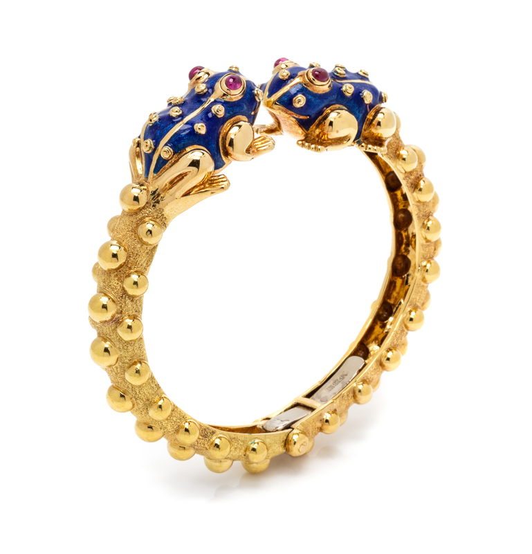 An 18 Karat Yellow Gold, Ruby and Enamel Frog Cuff Bracelet, David Webb, 30.45 dwts.
