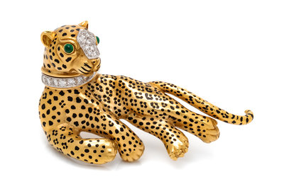 An 18 Karat Yellow Gold, Platinum, Diamond, Emerald and Enamel Leopard Brooch, David Webb, 33.40 dwts.