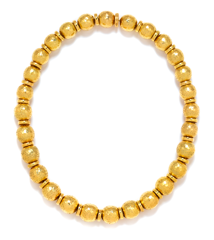 consisting of 28 hammered gold beads measuring approximately 14.20 mm in diameter alternating with gold spacer beads strung on gold wire with a hidden boule clasp.Stamp: WEBB 18K.